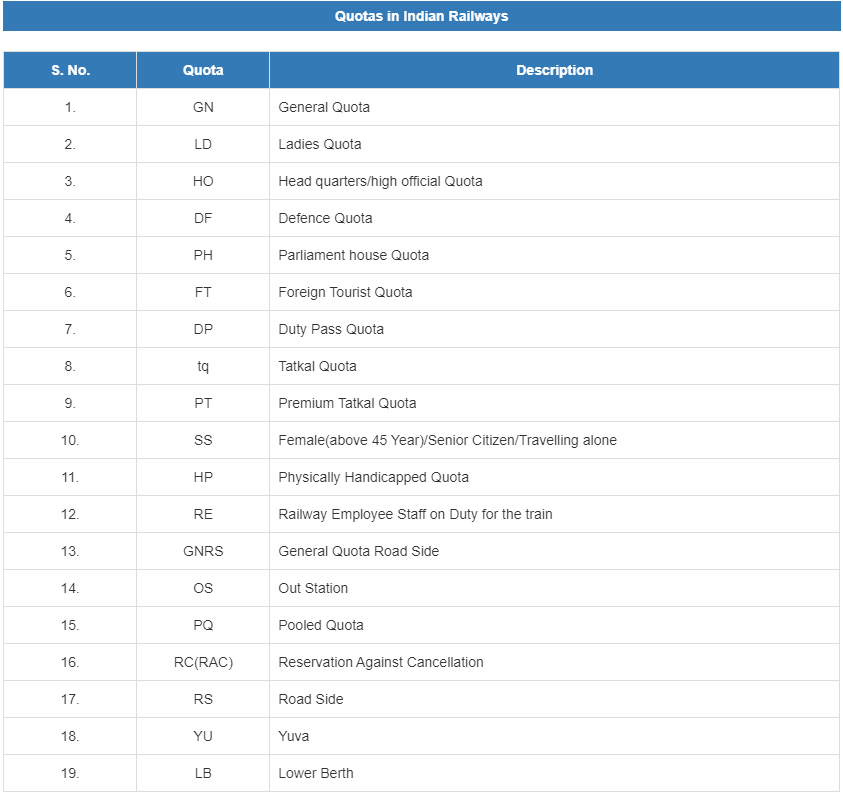 Some of the quotas like Senior Citizen Quota (SS), Ladies Quota (LD), Handicapped Quota (HP) etc are very useful and a necessity for Senior citizens, pregnant ladies, or handicapped travellers. The only requirement is that you should completely understand all these different quotas before booking your tickets. For example, how many of you know that ladies above age of 45 years, travelling alone, have a special quota for them known as SS quota. Even if those ladies aren’t travelling alone, they become eligible for that quota if their ticket is booked independently, in a separate PNR which effectively means that they are travelling alone.