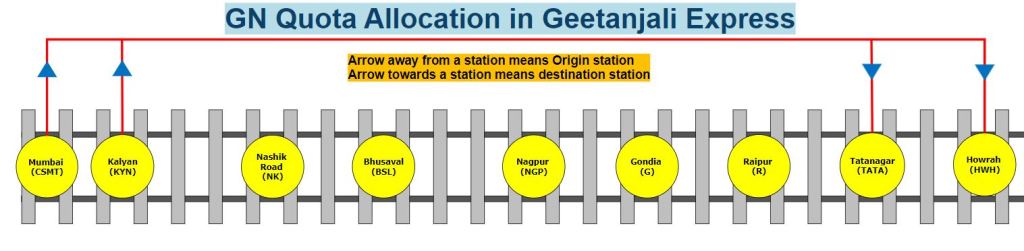 For Example – In Geetanjali SF Express (12859/60) which is a very famous train connecting Mumbai to Howrah (Kolkata), if you book your ticket from Mumbai CSMT or Kalyan to Tata /Kharagpur/Howrah, you will be allotted GN quota seats/waitlist.